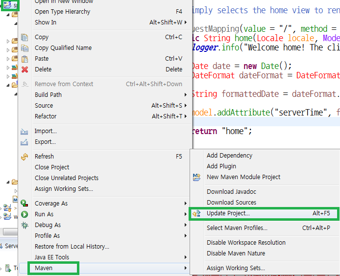 그래도 실행되지 않는다면 프로젝트명 우클릭 > maven > Update Project 또는 Run As > Maven clean