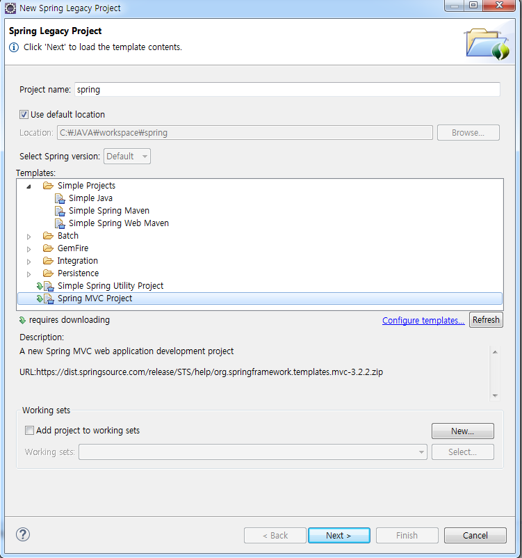 - Spring Legacy Project를 선택하면 Template을 선택할 수 있는데 여기서 Spring MVC Project 선택(웹 어플리케이션을 만들 것이므로)NEXT 를 누르면 파일 다운로드 창이 나오는데 YES 선택