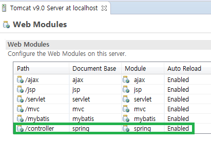 - spring 프로젝트의 경로가 controller인 것을 확인할 수 있다(레거시 프로젝트는 프로젝트명이 context명이 되지 않고 가장 처음에 입력했던 패키지 이름으로 context명이됨)