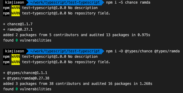 - 전역으로 ts-node 를 설치했지만 다른 개발자의 컴퓨터에는 전역으로 설치가 안 돼있을 수 있기 때문에 패키지를 -D 옵션으로 package.json 에 등록